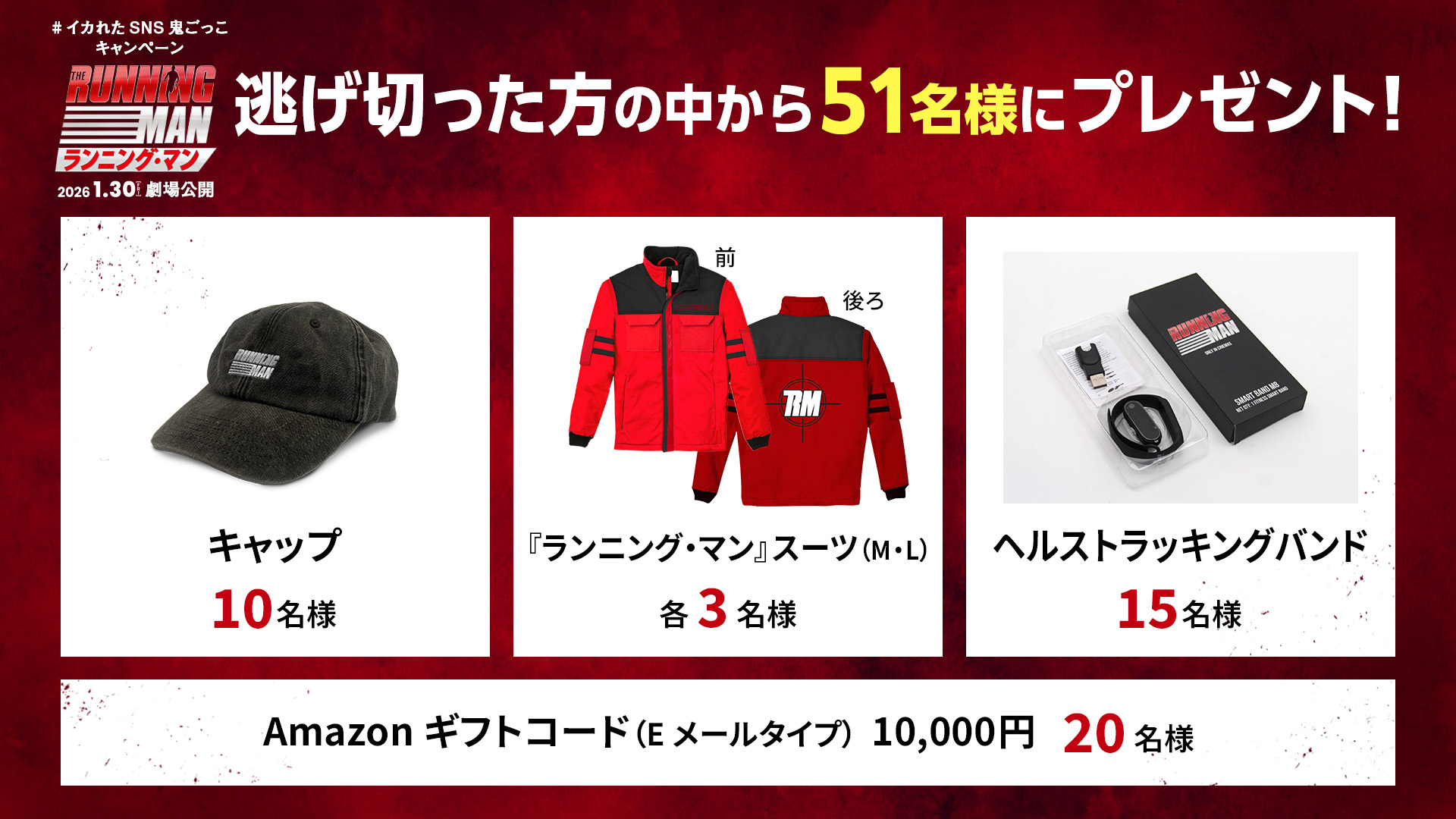 - 応募される際は、映画『ランニング・マン』公式Xアカウントをフォローし、指定ハッシュタグ「#イカれたSNS鬼ごっこキャンペーン」と「@RunningMan_jp」を付けて応募してください。